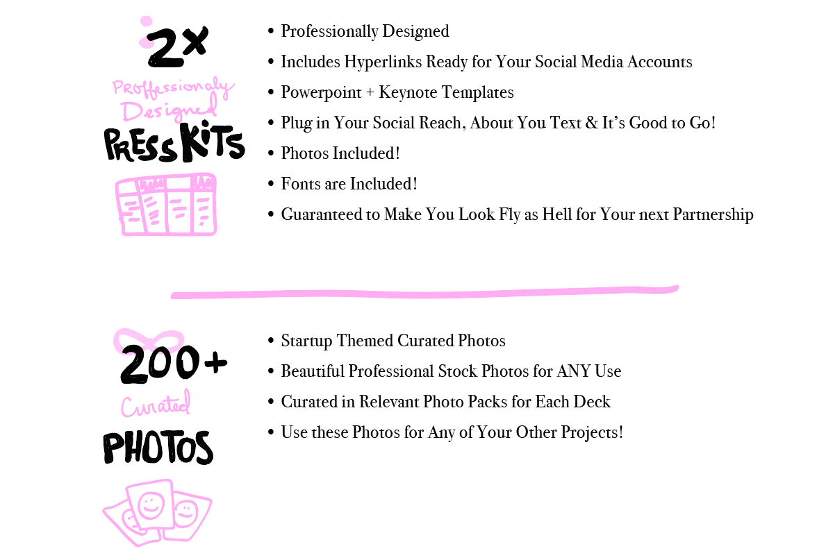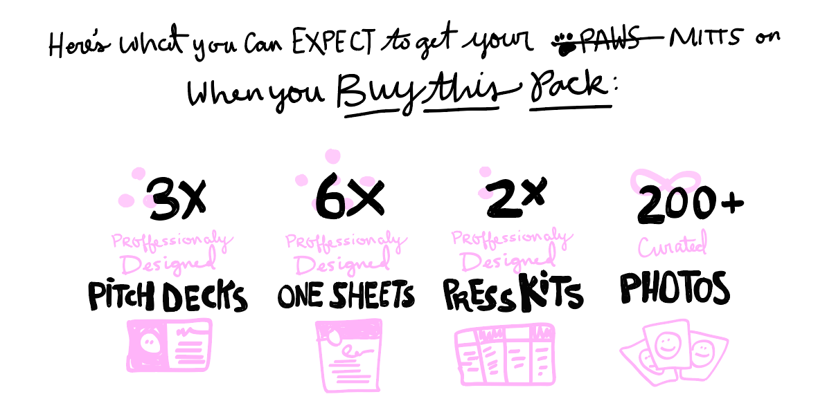 But seriously, this pack is full of professionally designed templates to sell your services. The pack is full of— pitch decks, one sheets, press kits and stock photos.